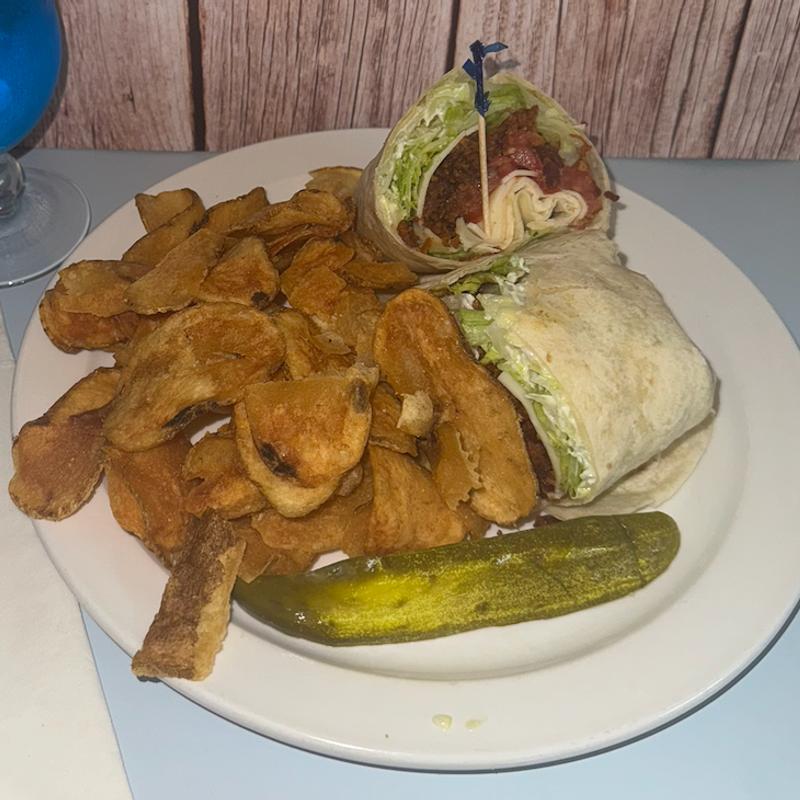 Served on a flour tortilla with your choice of French fries, coleslaw, pasta salad or homemade chips | Add sweet potato fries or tater tots for $1.00.